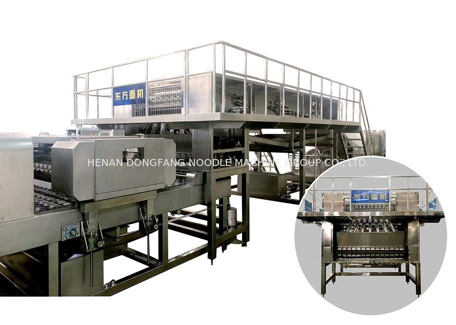 Συνεχής μίξη--Ομογενοποίηση--Ωριμάστε τη μεταβίβαση--Κύλισμα--Βράσιμο στον ατμό--Τέντωμα και κοπή--Αυτόματες φύσηγμα και διαμόρφωση--Τηγάνισμα--Ψύξη--Συσκευασία